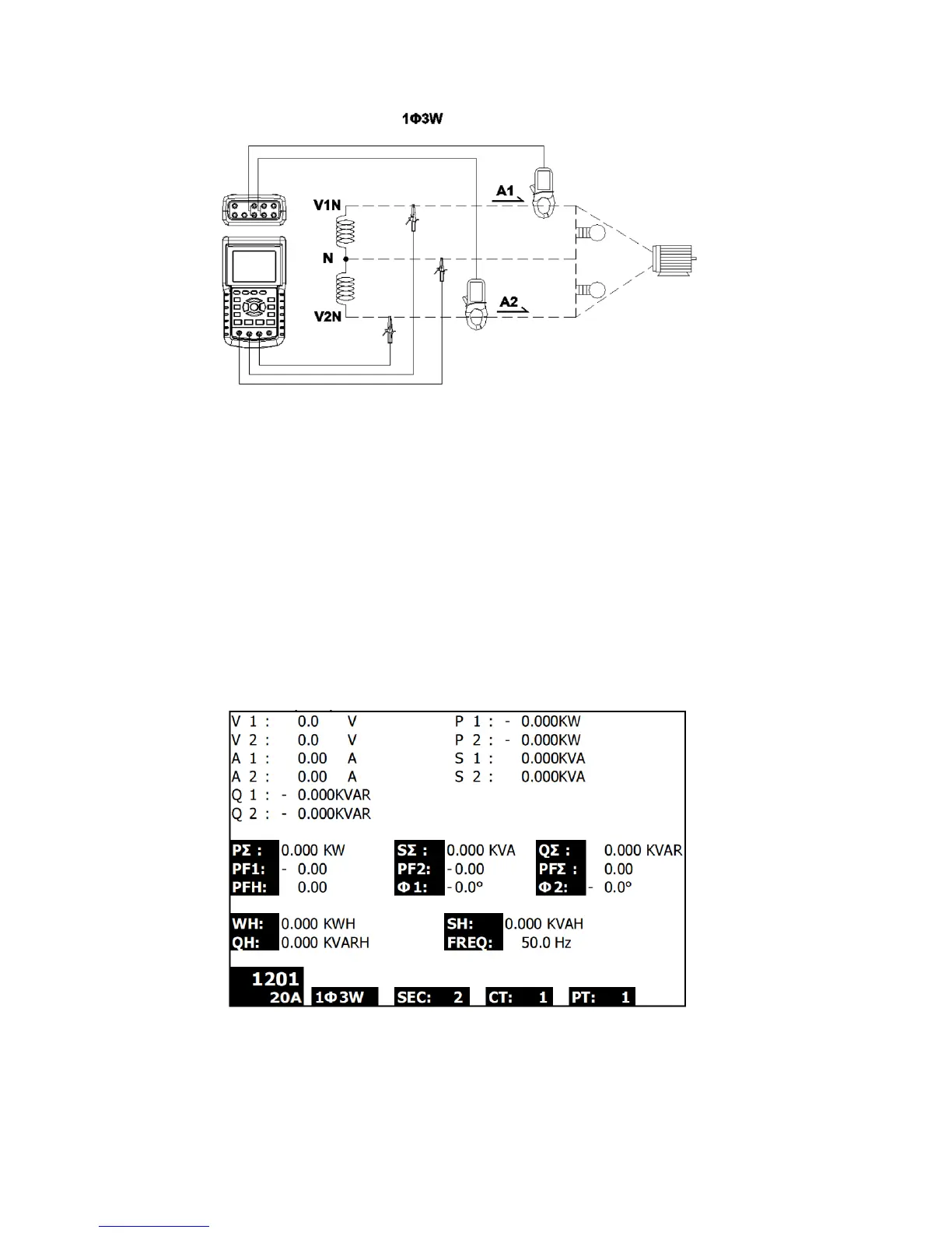 press the ‘1Φ 3Φ’ key (item 3-22) to select 1Φ 3W, the selected name of the configuration