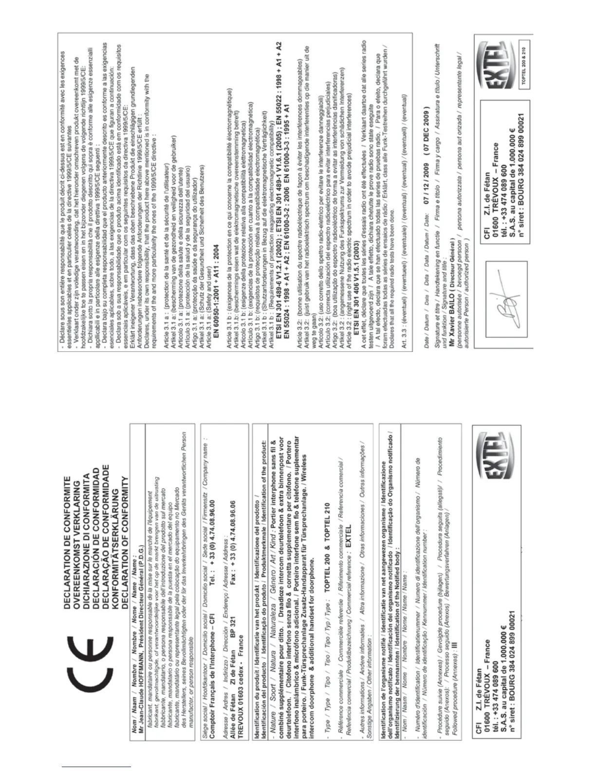 Extel TOPTEL 200 - Declaration of Conformity and Contact Information