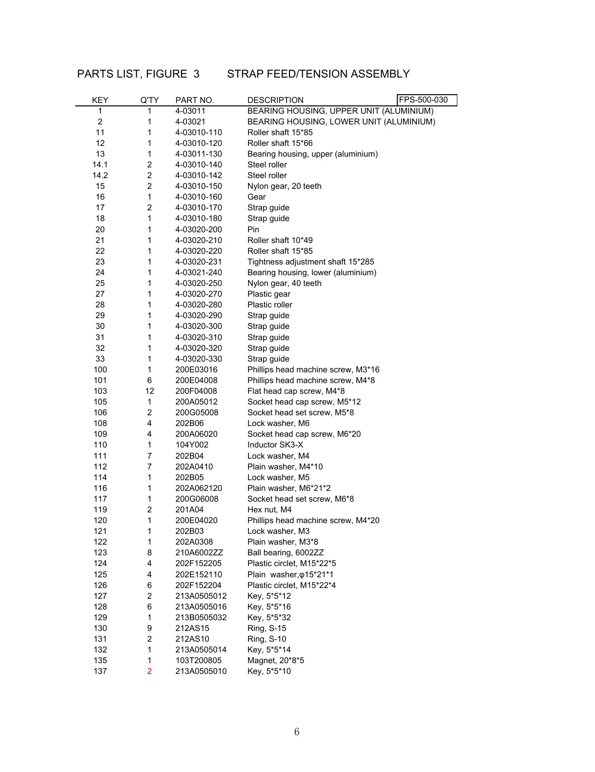 PARTS LIST, FIGURE 3 STRAP FEED/TENSION ASSEMBLY