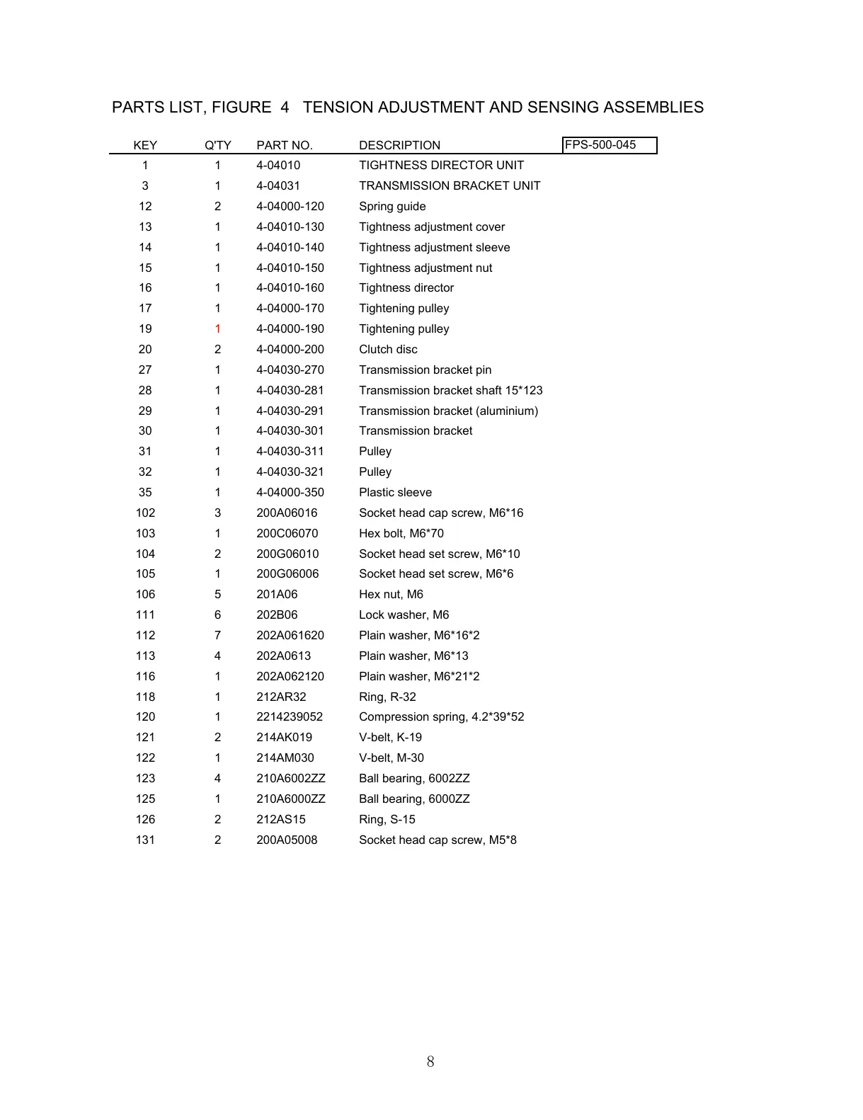 PARTS LIST, FIGURE 4 TENSION ADJUSTMENT AND SENSING ASSEMBLIES