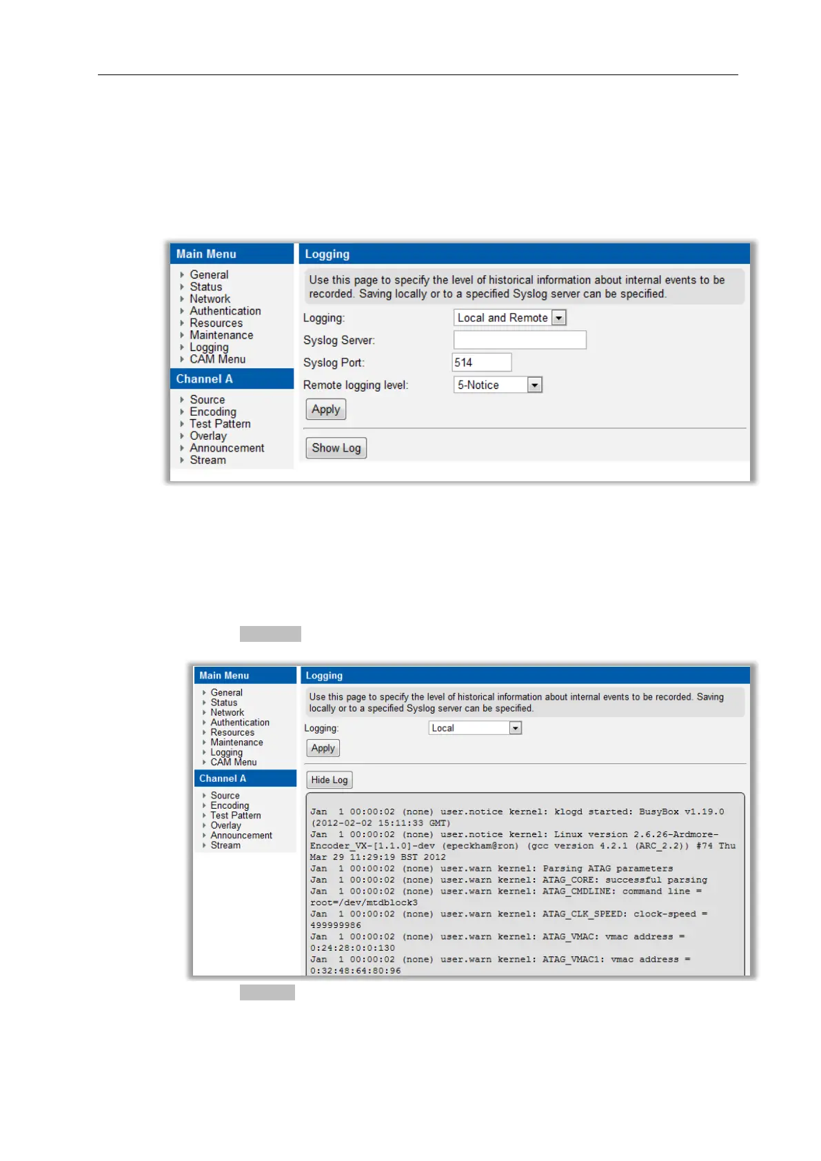 Logging is configured in the web interface Logging page as shown in Figure 13.