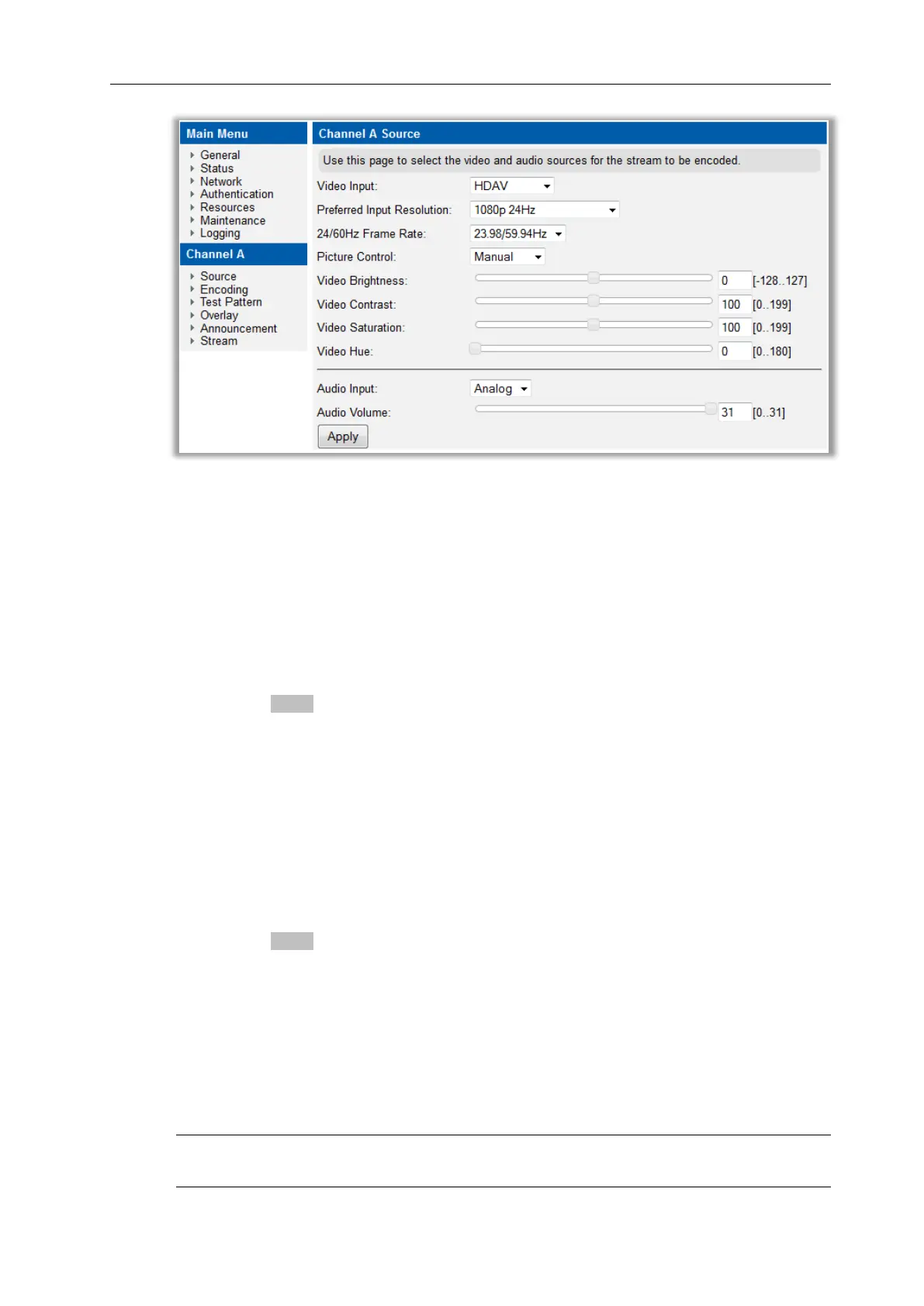 Figure 16 AvediaStream e3635 – Source Page Manual Controls