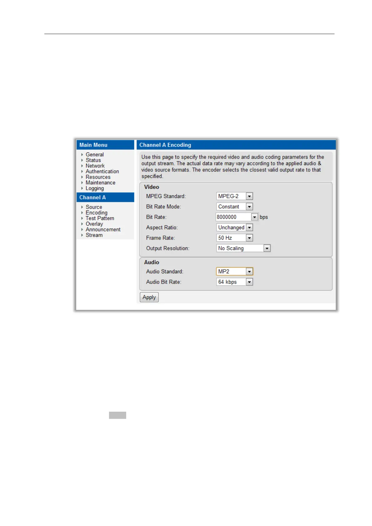 The Encoding parameters are configured from the Encoding page on the web interface as