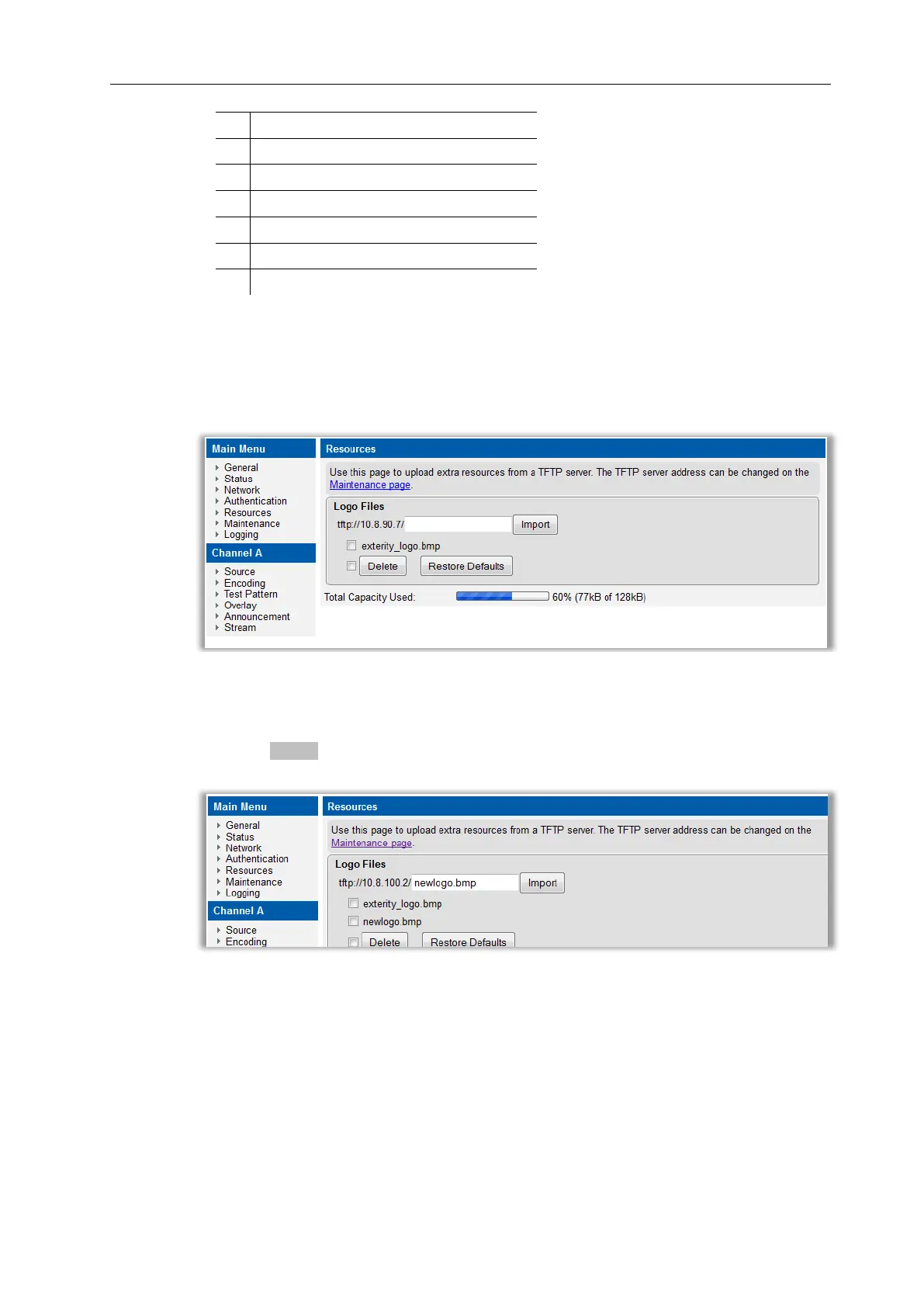 Logo files are uploaded to the encoder using TFTP and are listed on the Resources page.