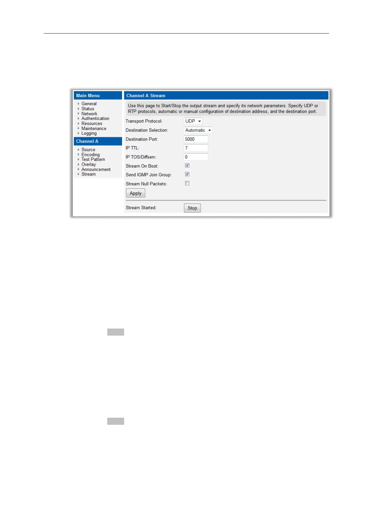 Stream Properties are configured using the web interface Stream page as shown in Figure 24.