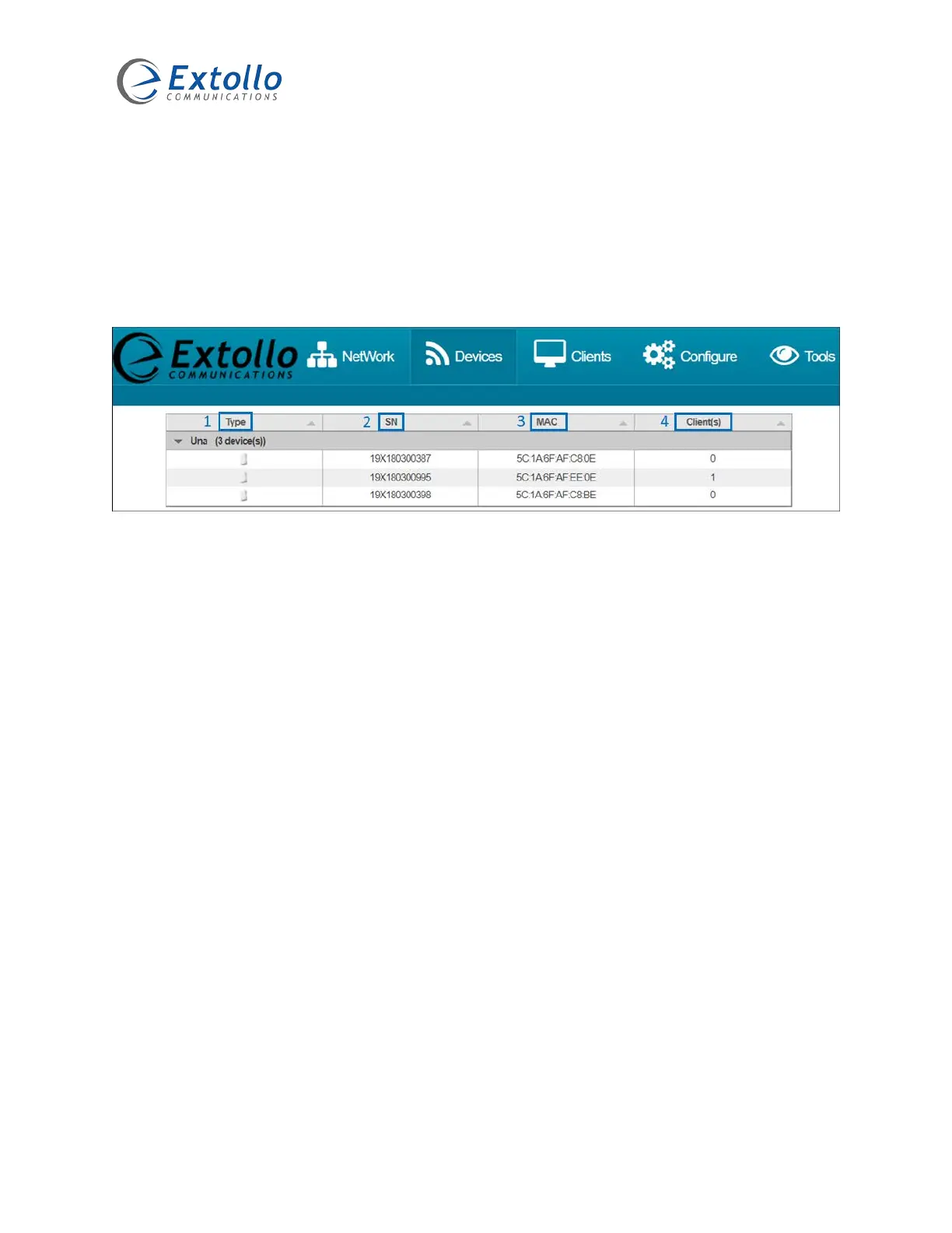 Displays all the Una’s within the meshed Wi-Fi network. It also provides the serial number, MAC