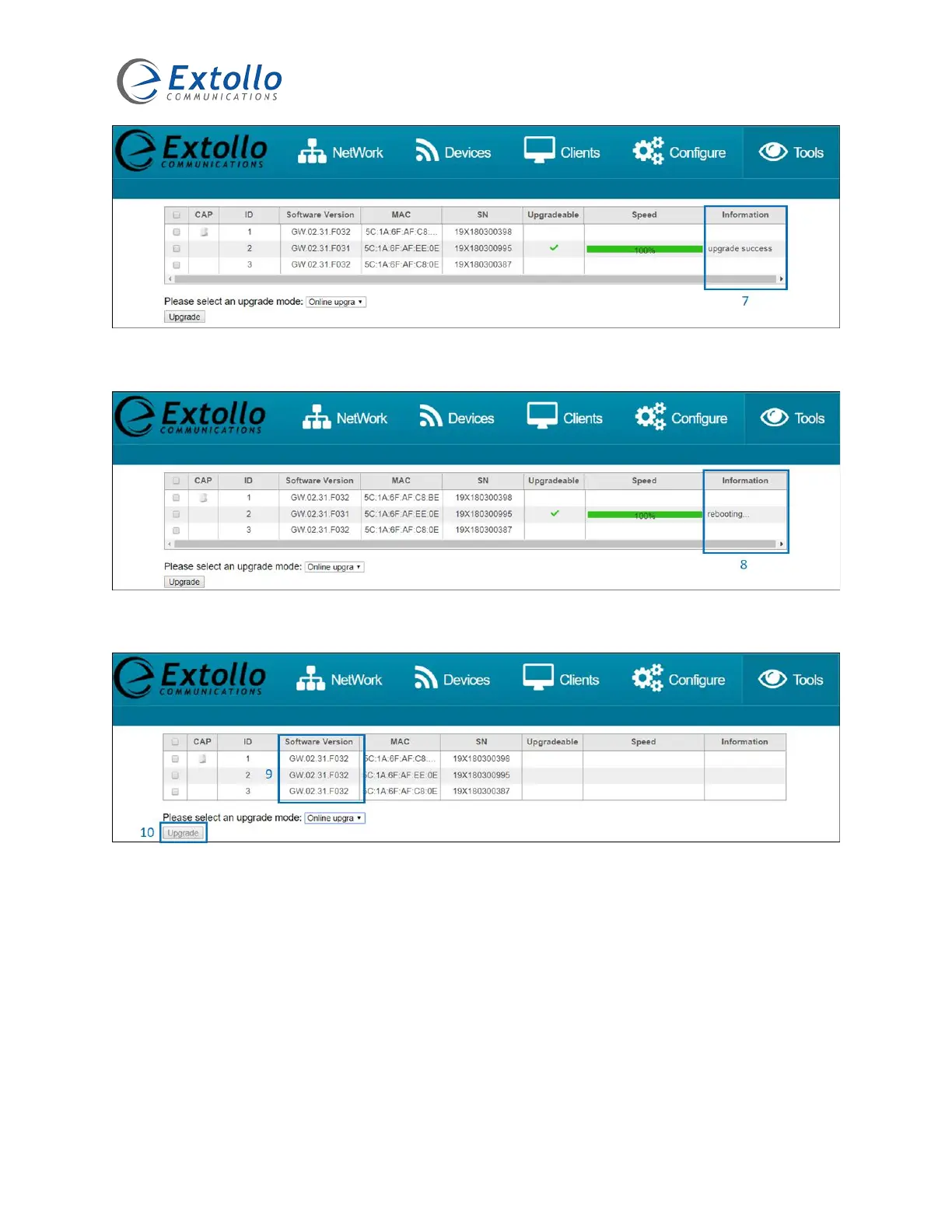 7. The upgrade is complete when the “Information” column states “upgrade success”.
