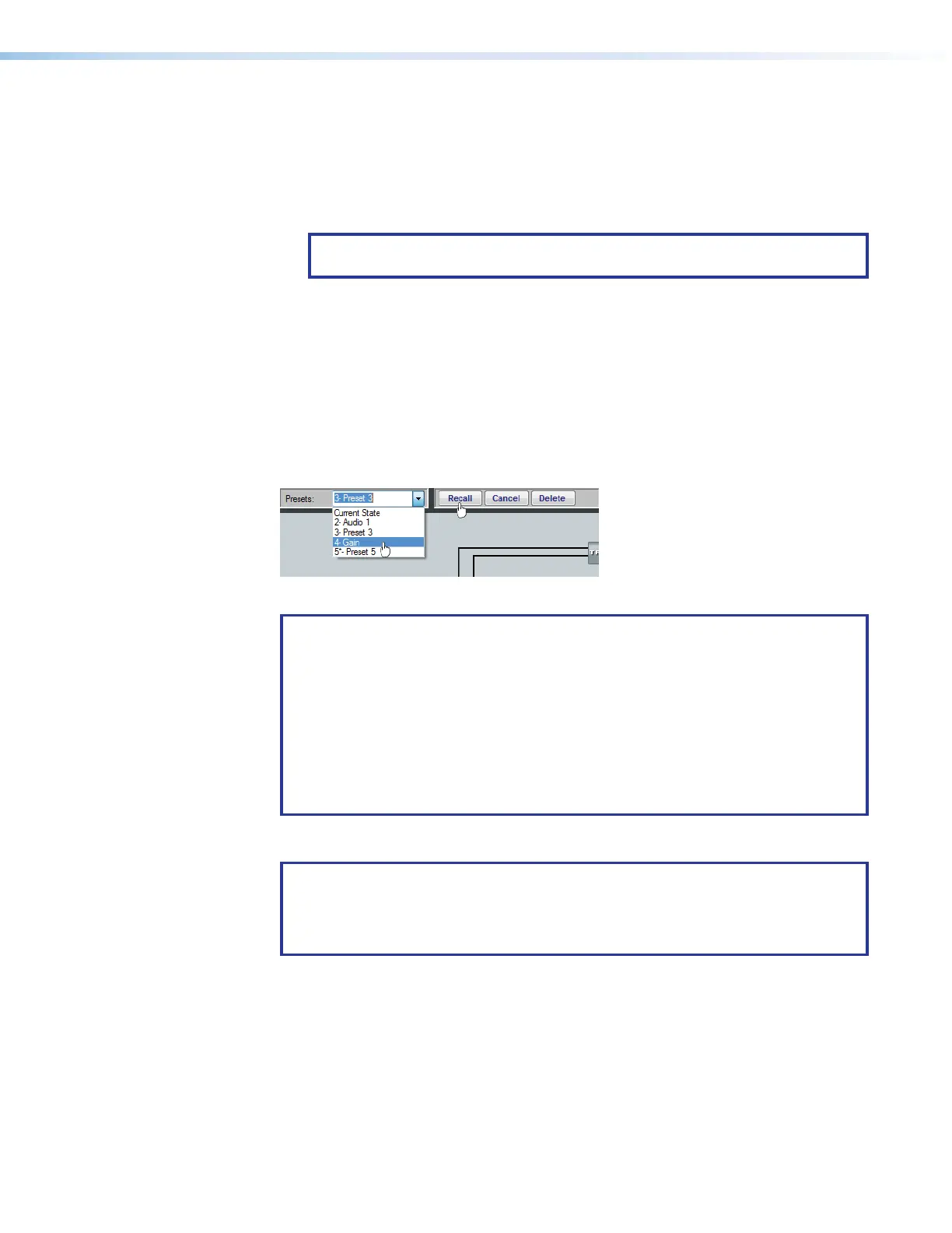 • Click Cancel to abandon the preset recall (but not deleting the preset) and