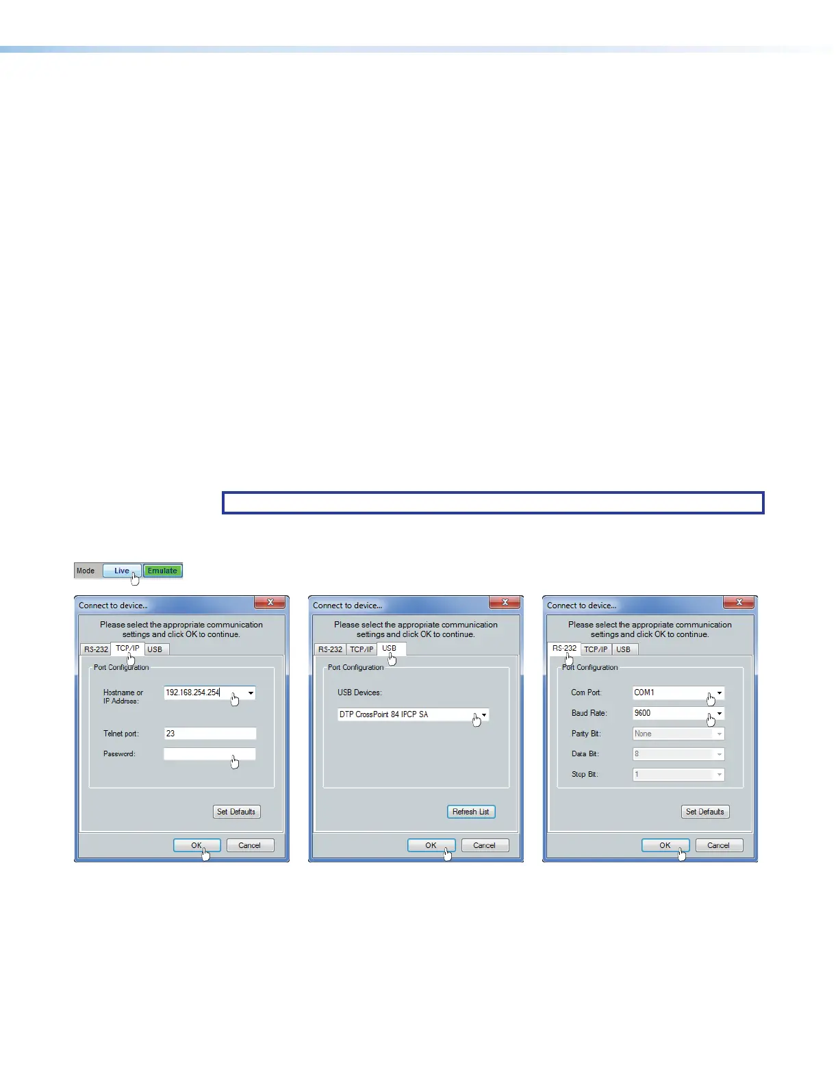 with either the TCP/IP tab, the USB tab, or RS-232 tab active.