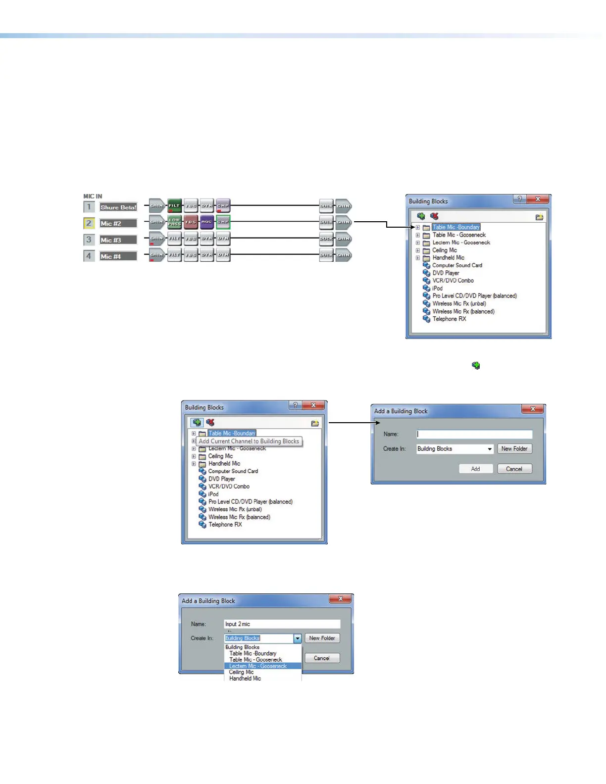Custom building blocks can be created if necessary, such as when a new mic is connected