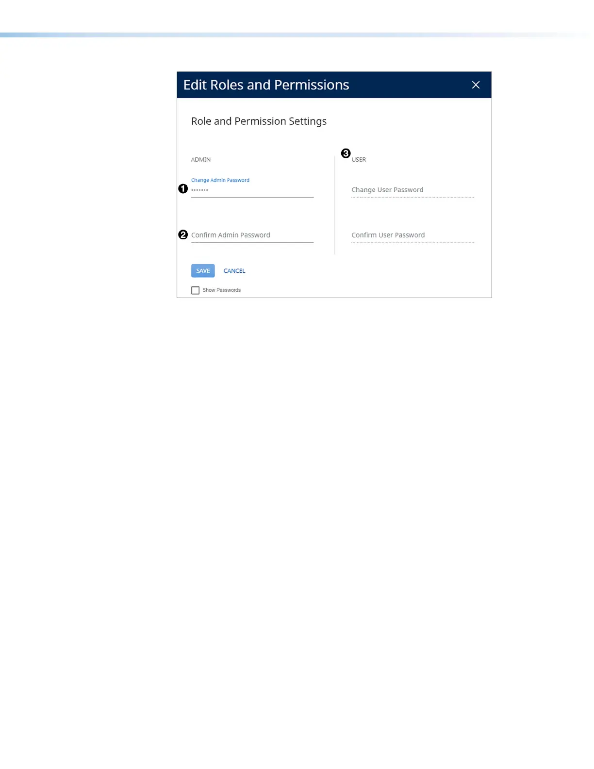 5. When finished, click Save to set the passwords. To close the window without saving a