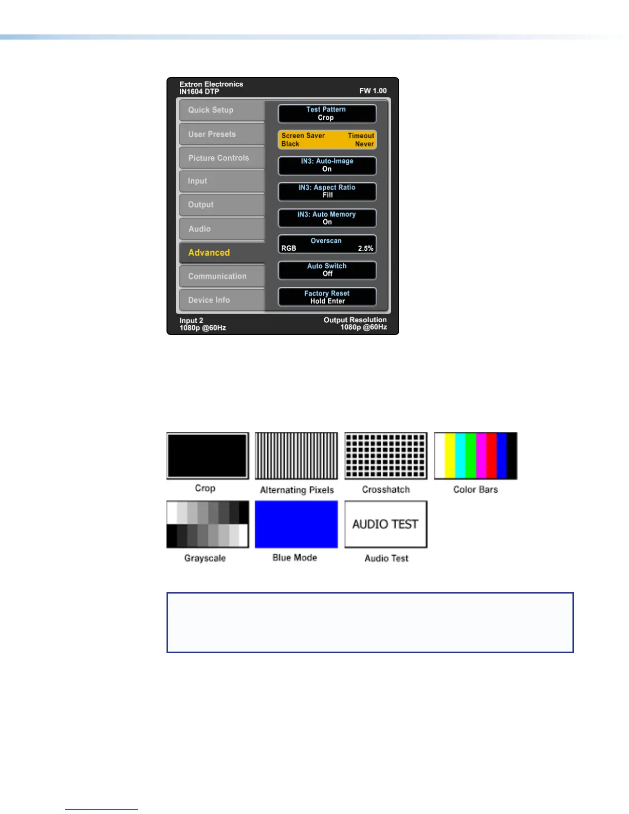 The Advanced submenu allows adjustment of test patterns, screen saver mode, automatic