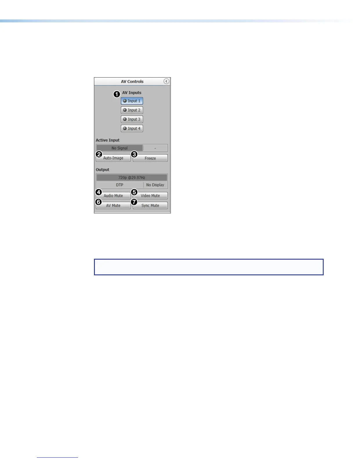 The AV controls panel is used to control AV settings such as input selection, one-time