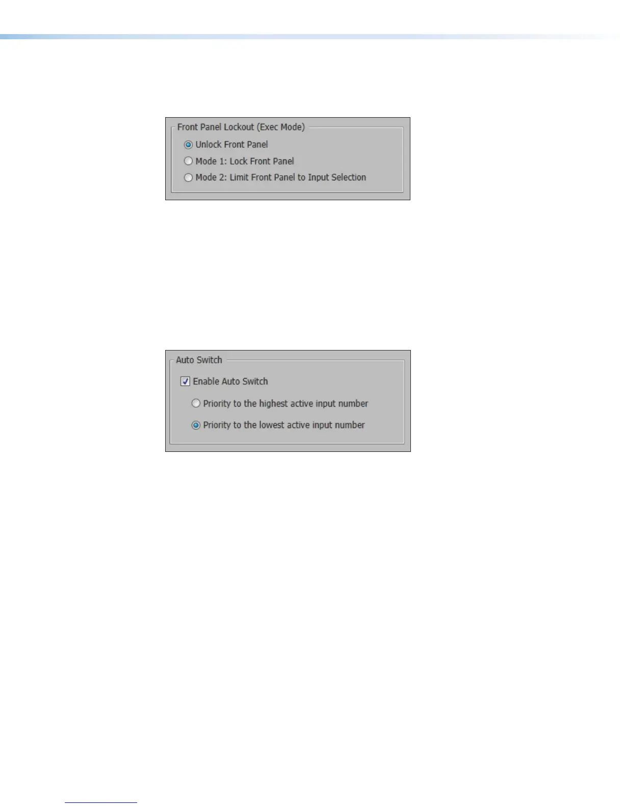 • Mode 2: Limit Front Panel to Input Selection — Limits front panel control to