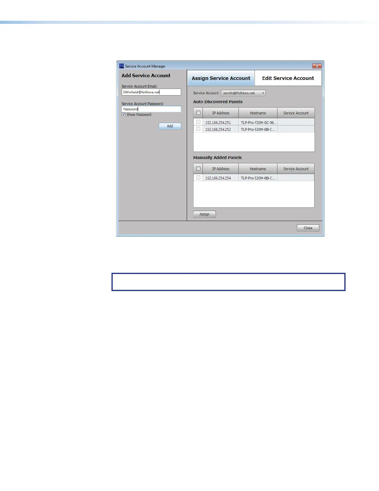 The Service Account Manager dialog box opens, with the Assign Service Account
