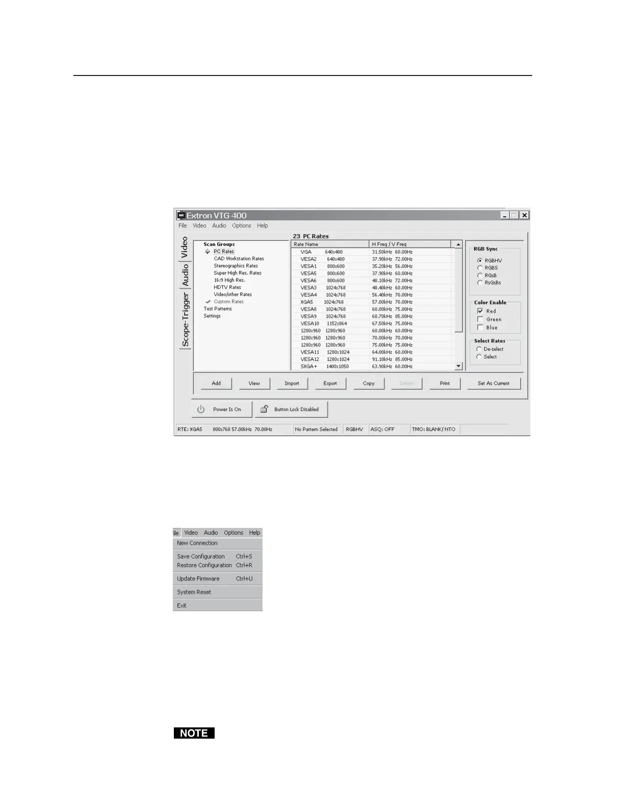 • Update Firmware loads the VTG with firmware from a *.bin file.