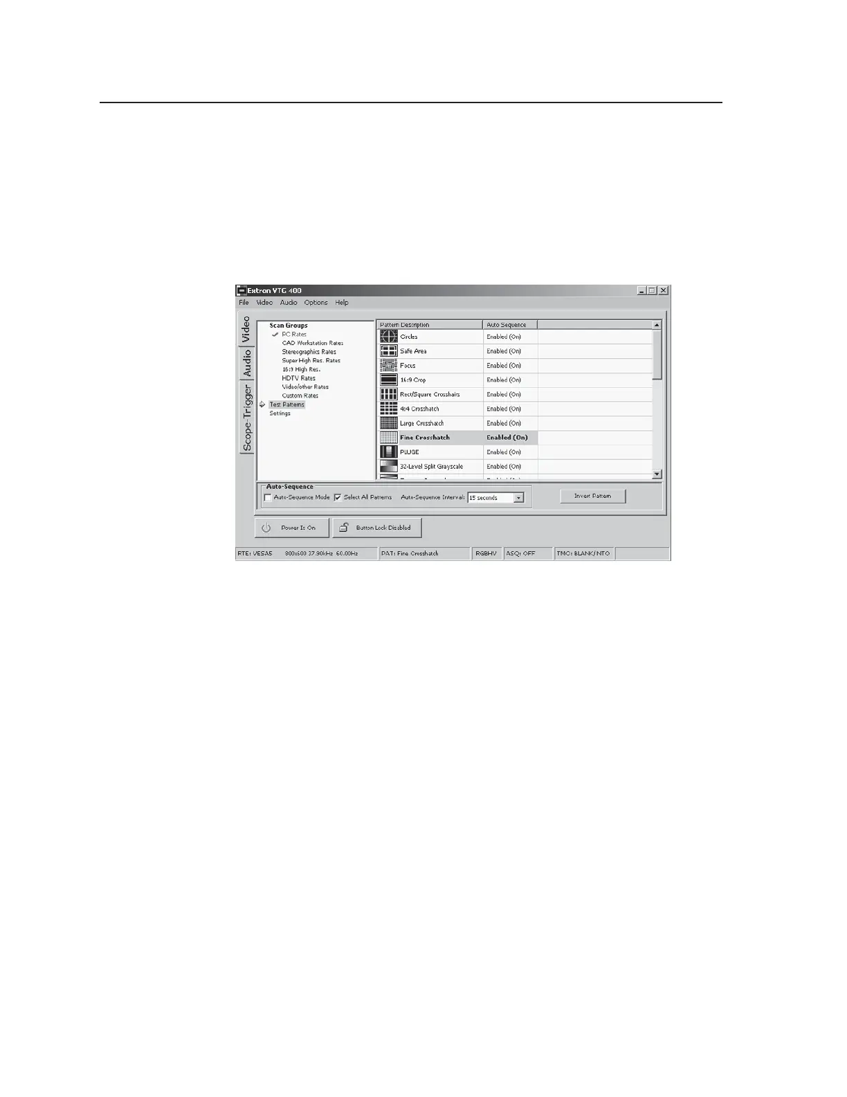 The Test Patterns screen, shown in the following illustration, allows you to select