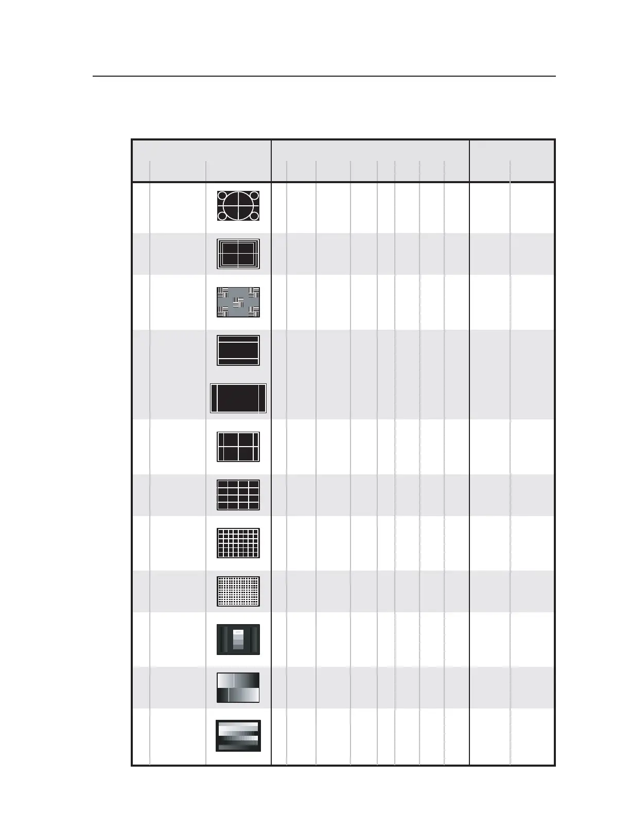 The following chart lists the VTG 400 test patterns and any special features.