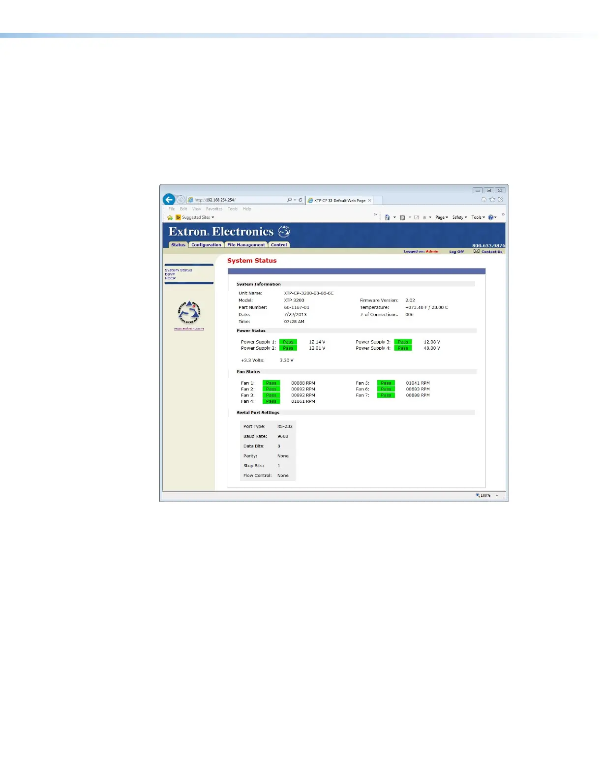 to the matrix switcher. Access the System Status page from other pages by clicking the