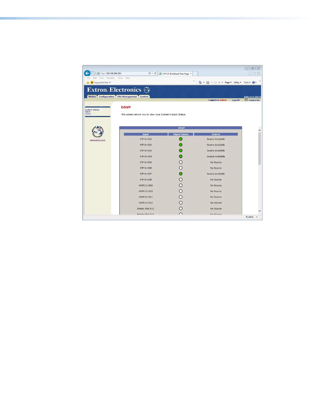The DSVP page (see figure 57) provides the connection status of the matrix switcher. Access