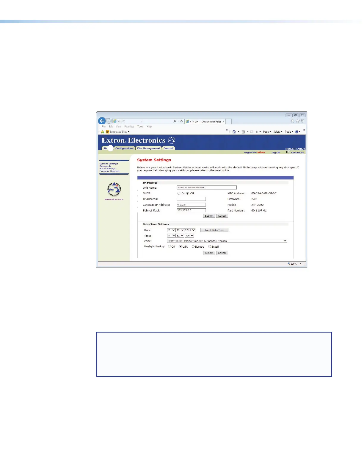 The XTP CrossPoint Series matrix switcher downloads the System Settings page (see