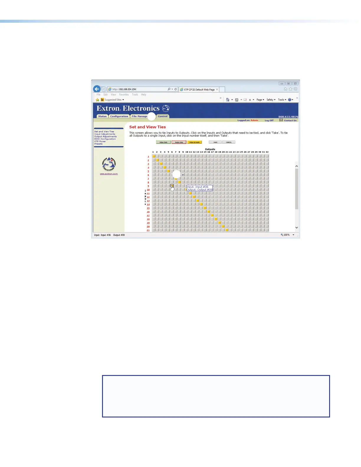 The page consists of a matrix of input (rows) and output (columns) selection buttons of four