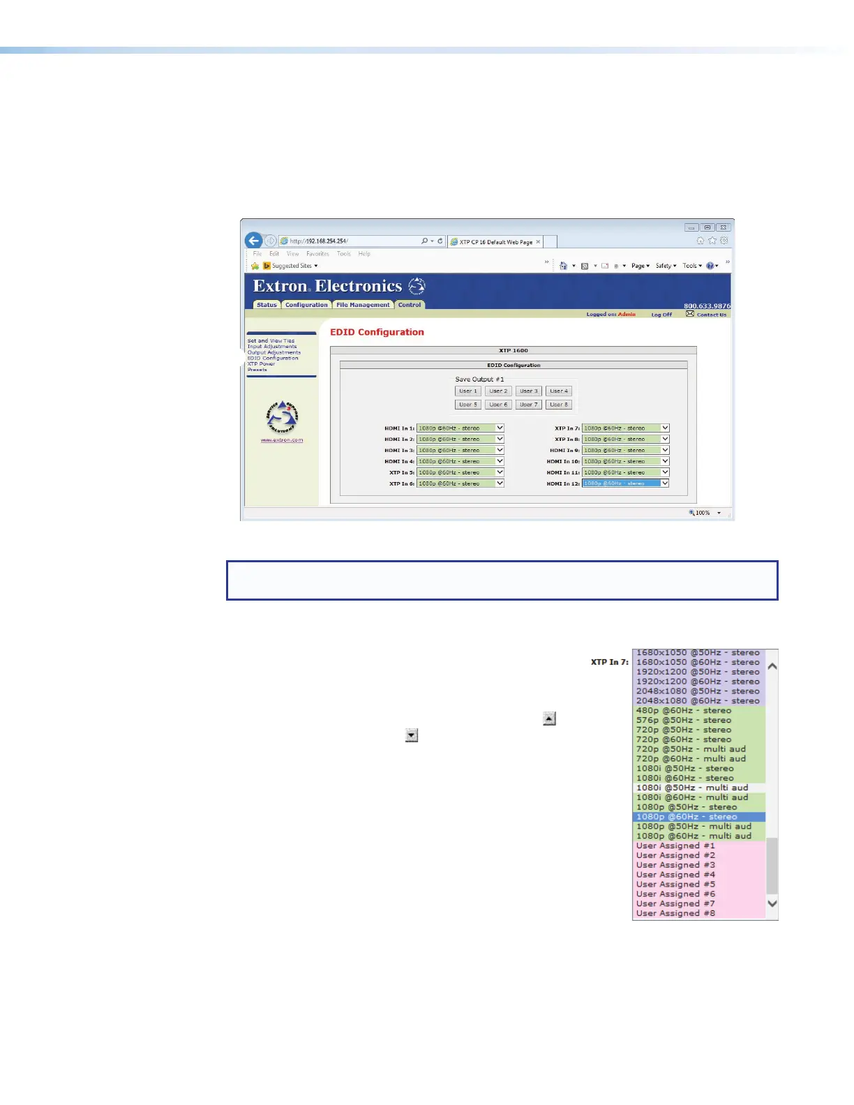 NOTE: The page displays the EDID drop boxes for inputs and outputs on installed