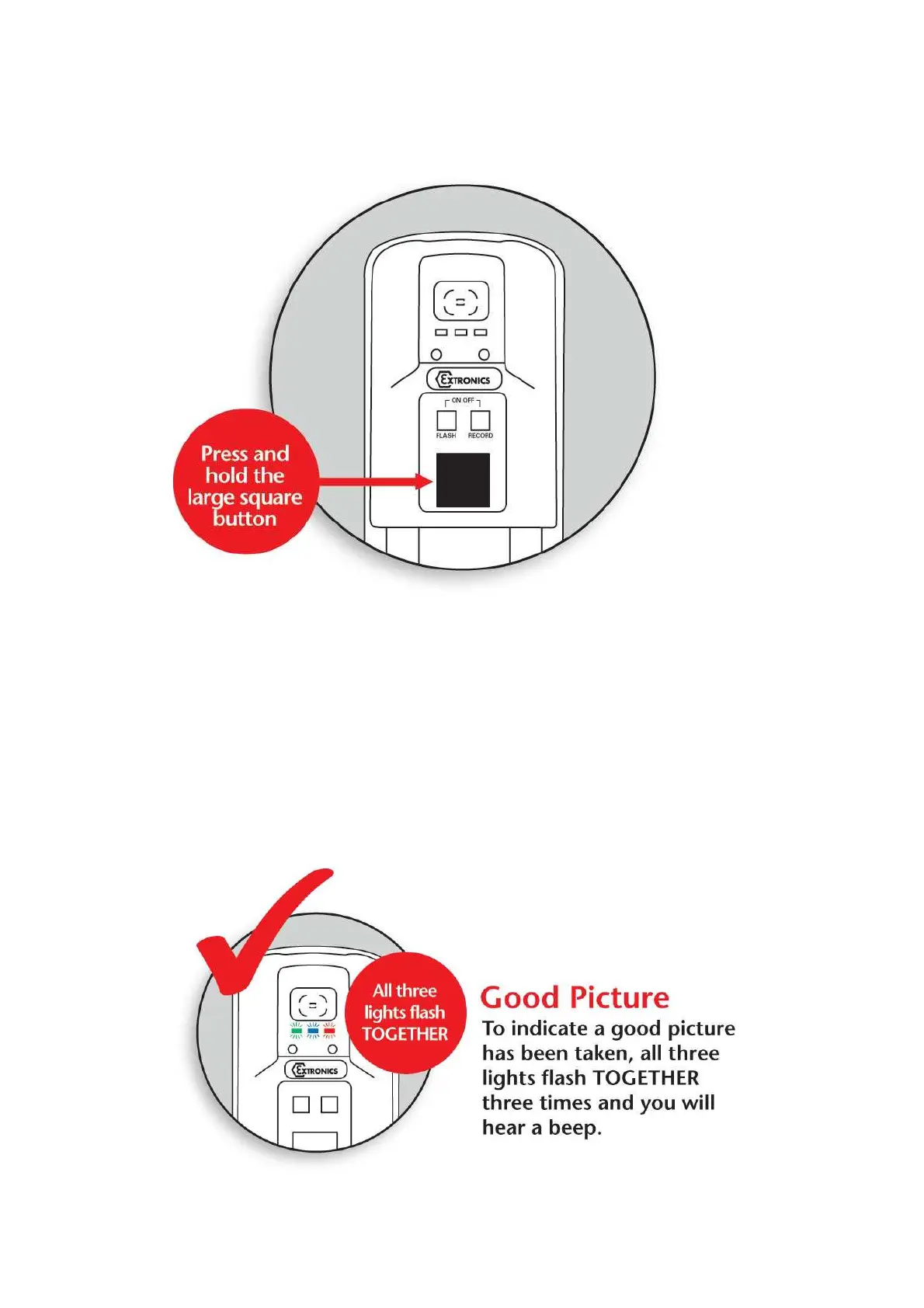 To indicate a good picture has been taken, all three LED’s flash TOGETHER three times and