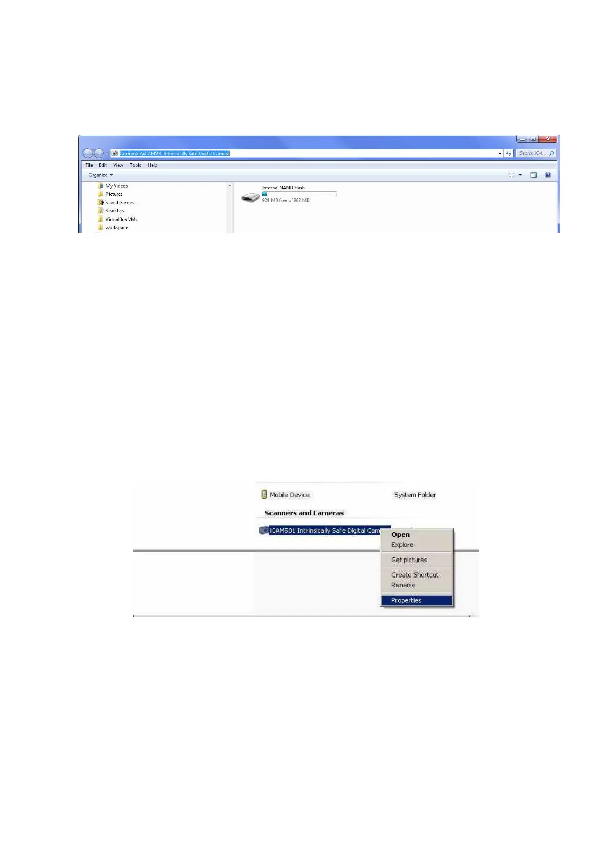 Simply browse to Computer\iCAM50x, and click on Internal NAND Flash as shown. Pictures