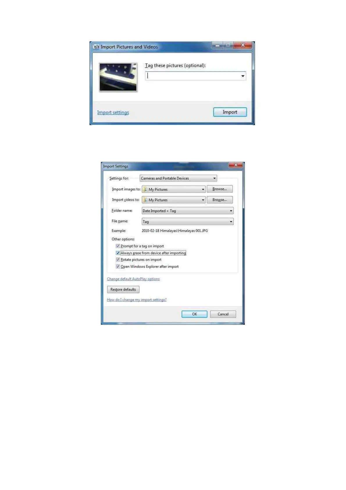 Click on the Import settings to customize the where and the way in which Windows will