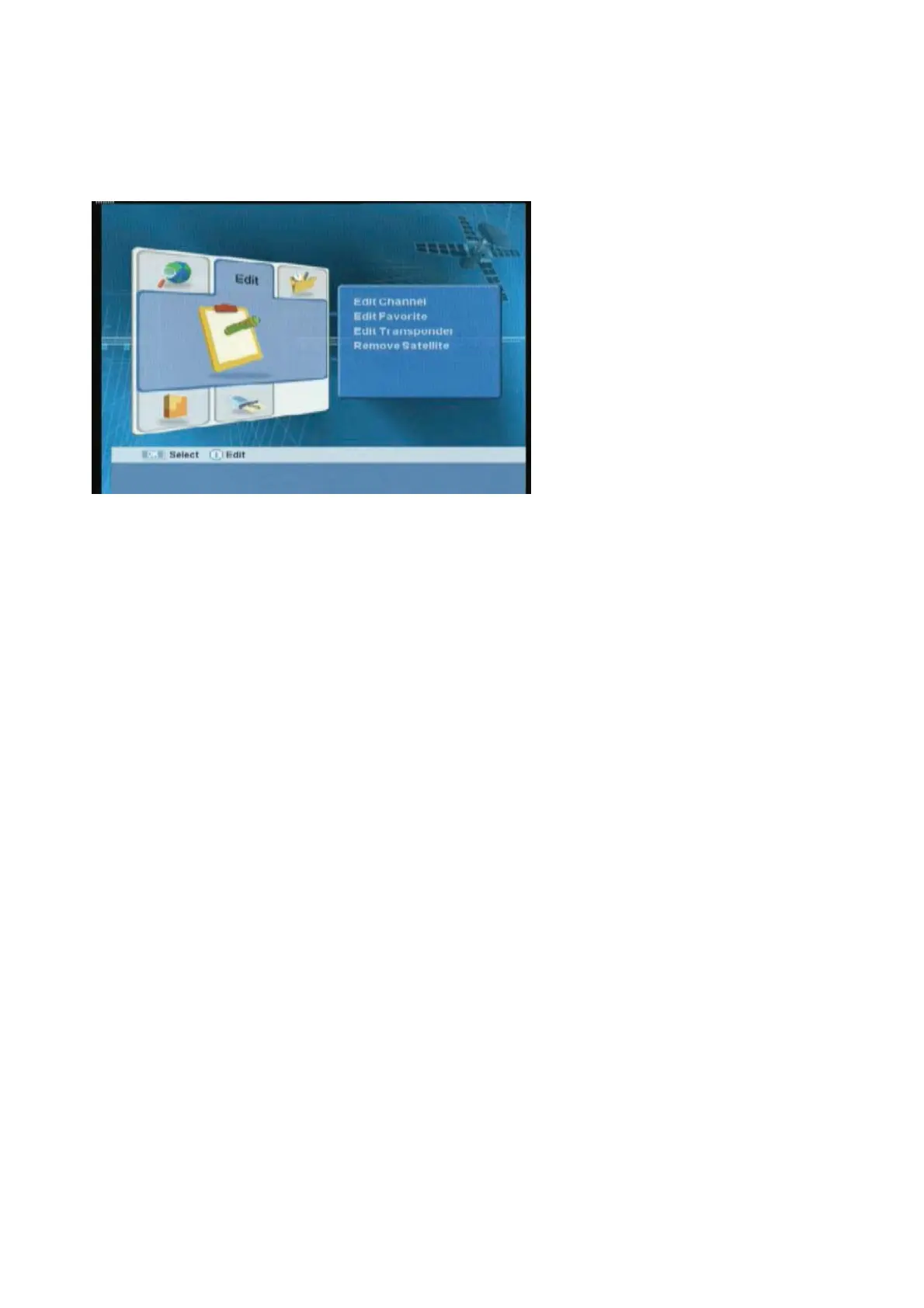 You can edit channel(s), favorite channel(s), transponder and remove satellite.