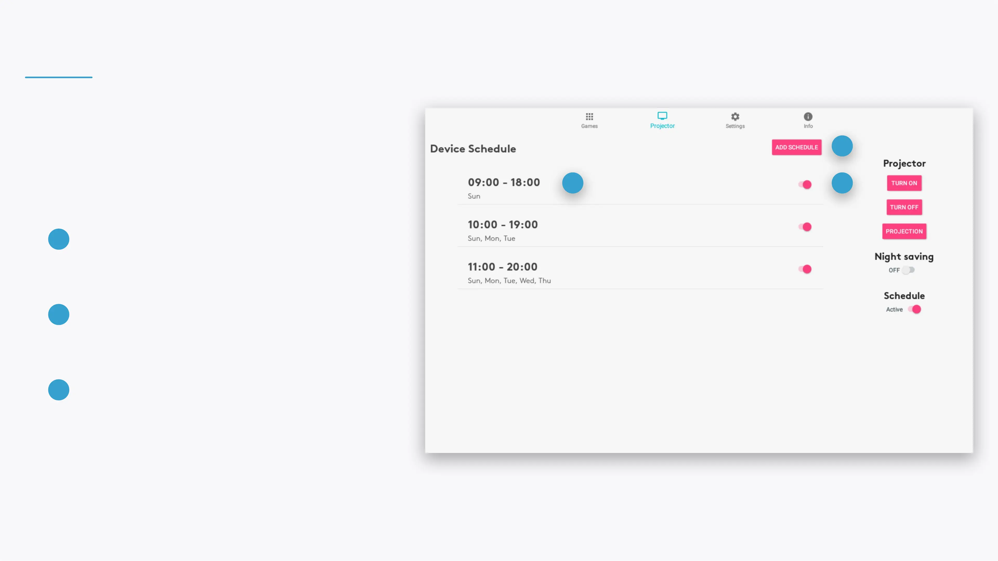 Turn the projection o, manage device schedules and