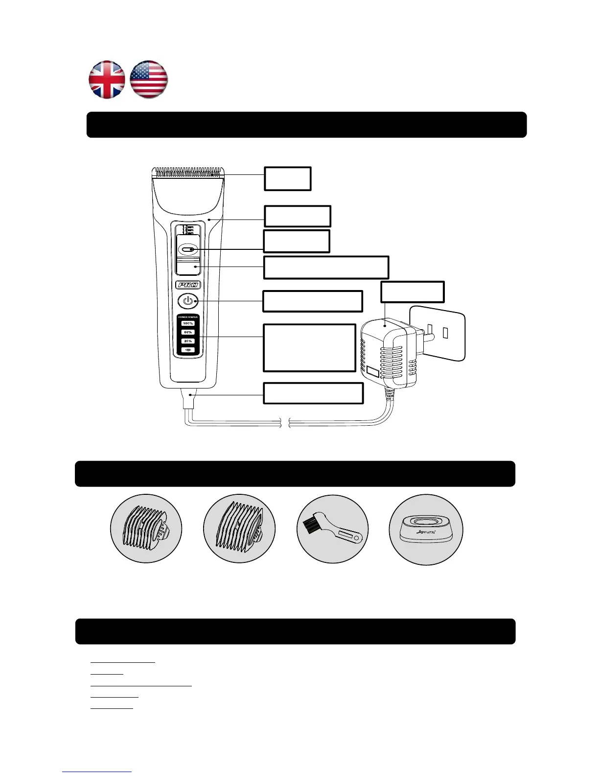 Comb 3/6mm Comb 9/12mm Cleaning brush Charging unit