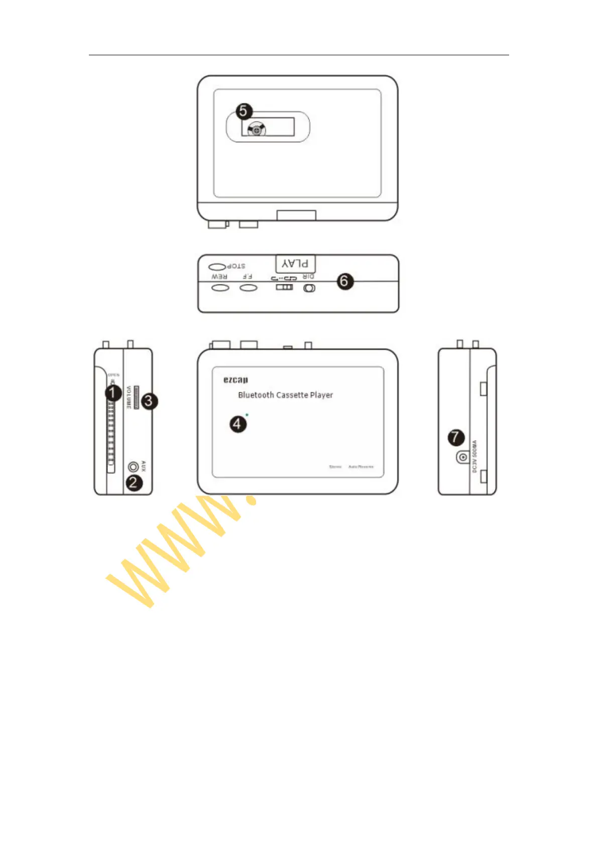 1,磁带仓盖开关 - 向下滑动以打开磁带仓盖,可以放入盒带。