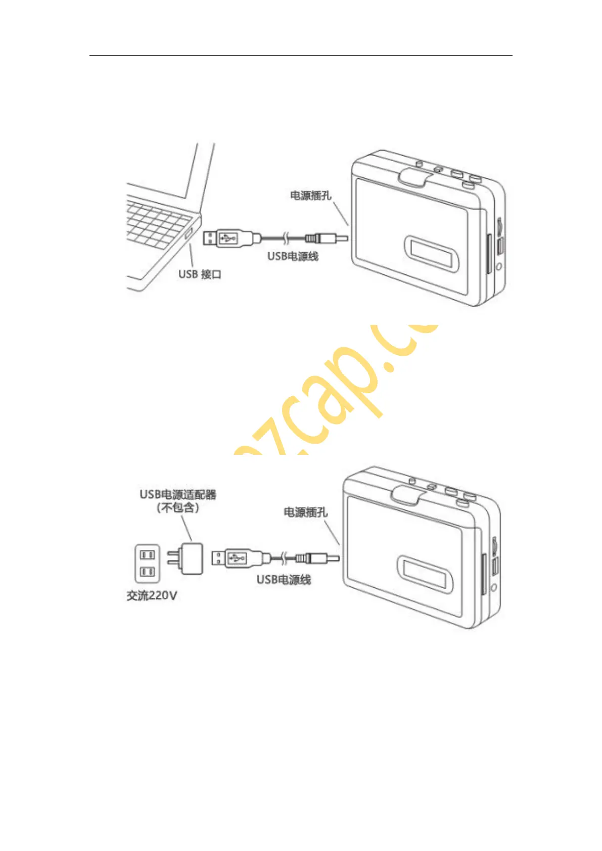 将随附的 USB 电源线与 USB 电源适配器和交流插座和盒式磁带播放器 DC 端口连接