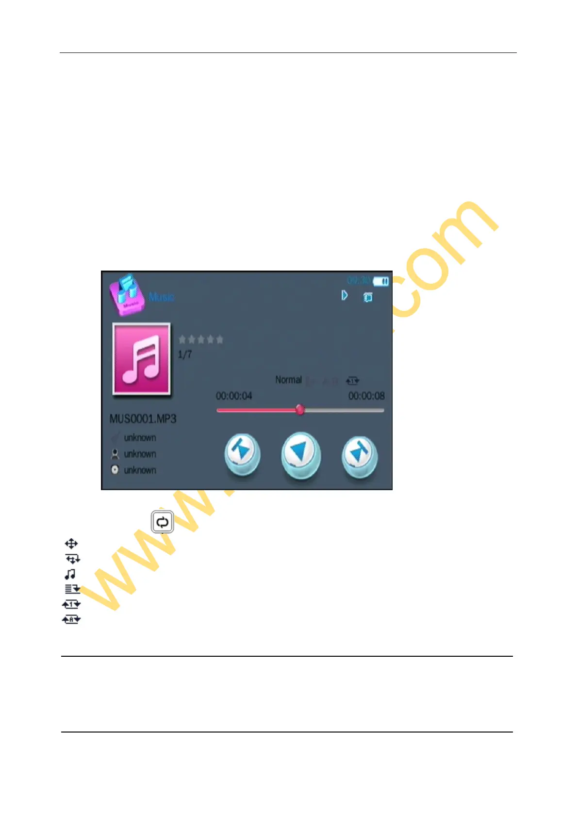 左右键快进和快退,连按两下左键或右键来选择上一首或下一首,按下返回键将会返回到音乐文件列表。