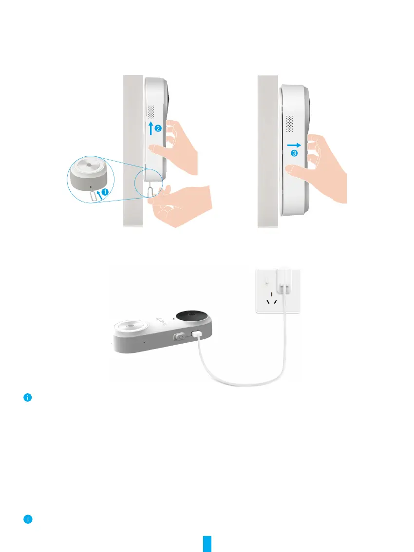 2. Use the pin provided to press and hold the hole on the bottom of the doorbell, meanwhile push the doorbell upwards and