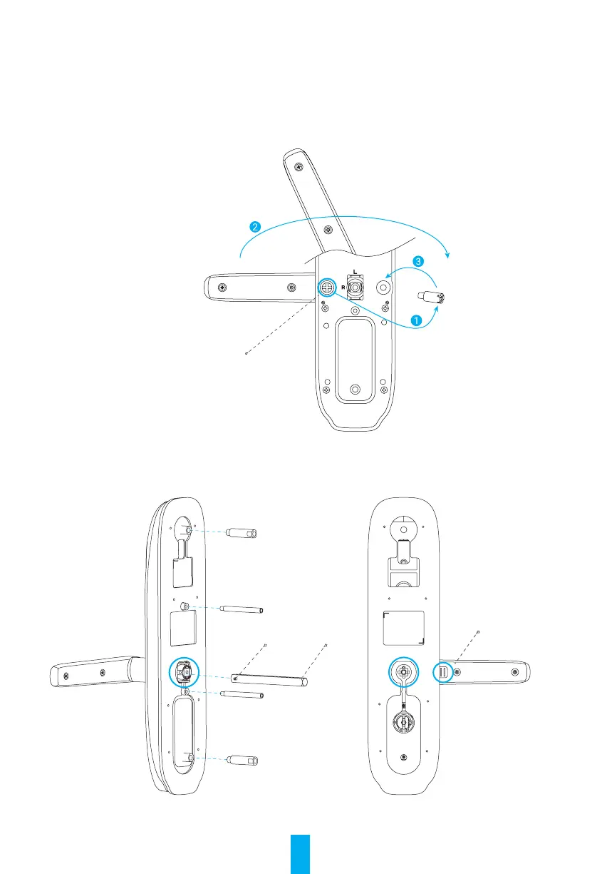 - Rear panel: Turn on the anti-peephole button. Insert square rod into sleeve and lift lever handle. Rotate