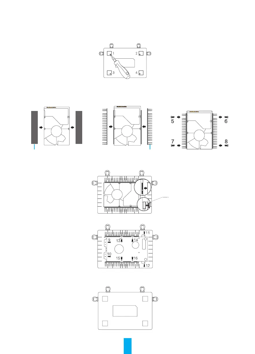 4. Use los cuatro tornillos para fijar el radiador a la unidad de disco duro. Consulte la figura siguiente.