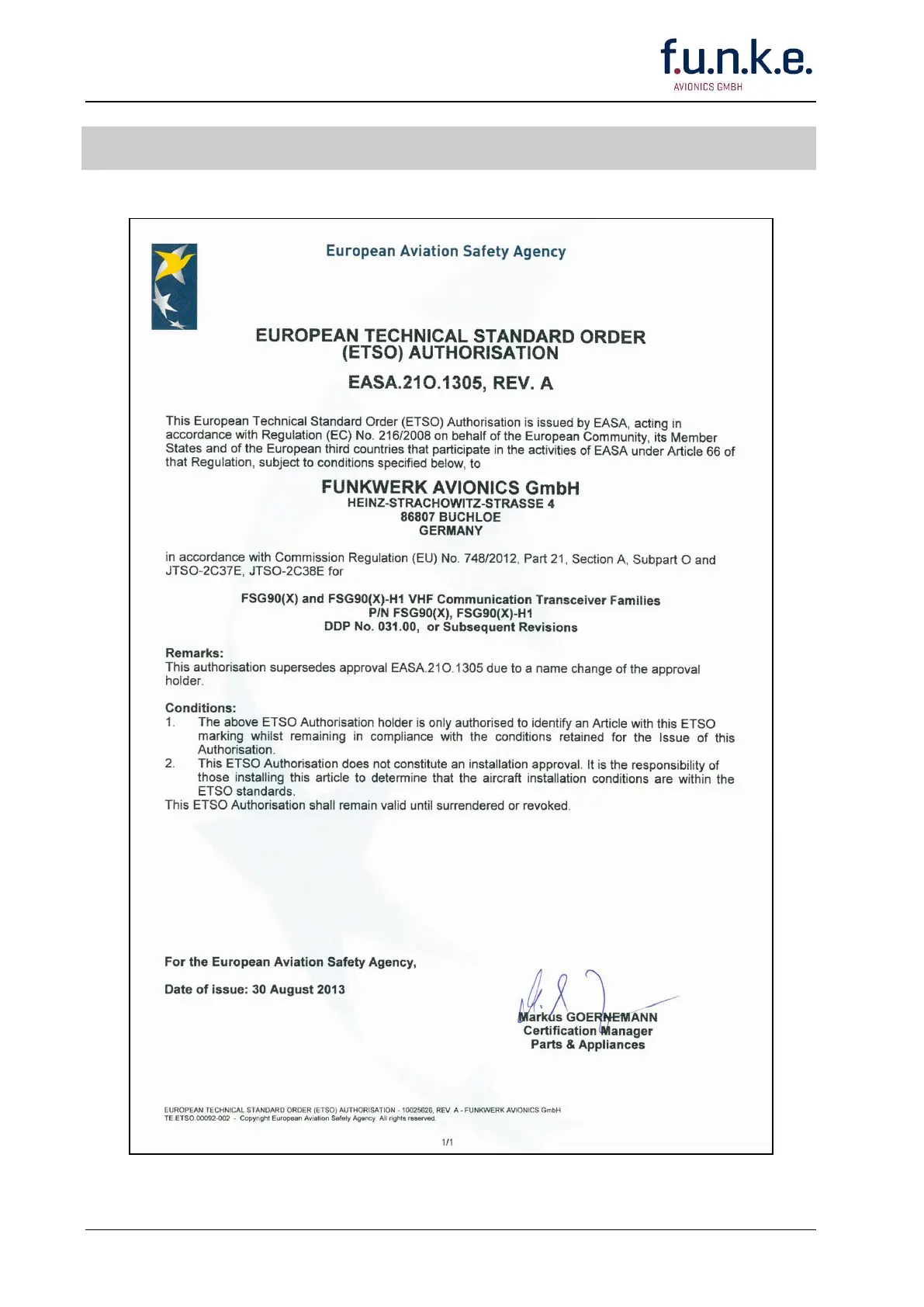 F.u.n.k.e. FSG 90 - Appendix D: Certificates; ETSO Authorization Certificate
