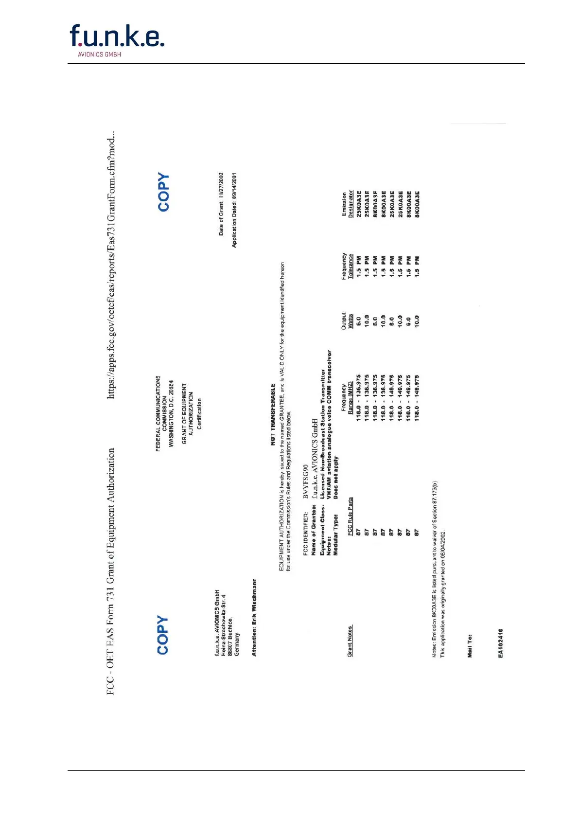 F.u.n.k.e. FSG 90 - FCC Grant of Equipment Authorization