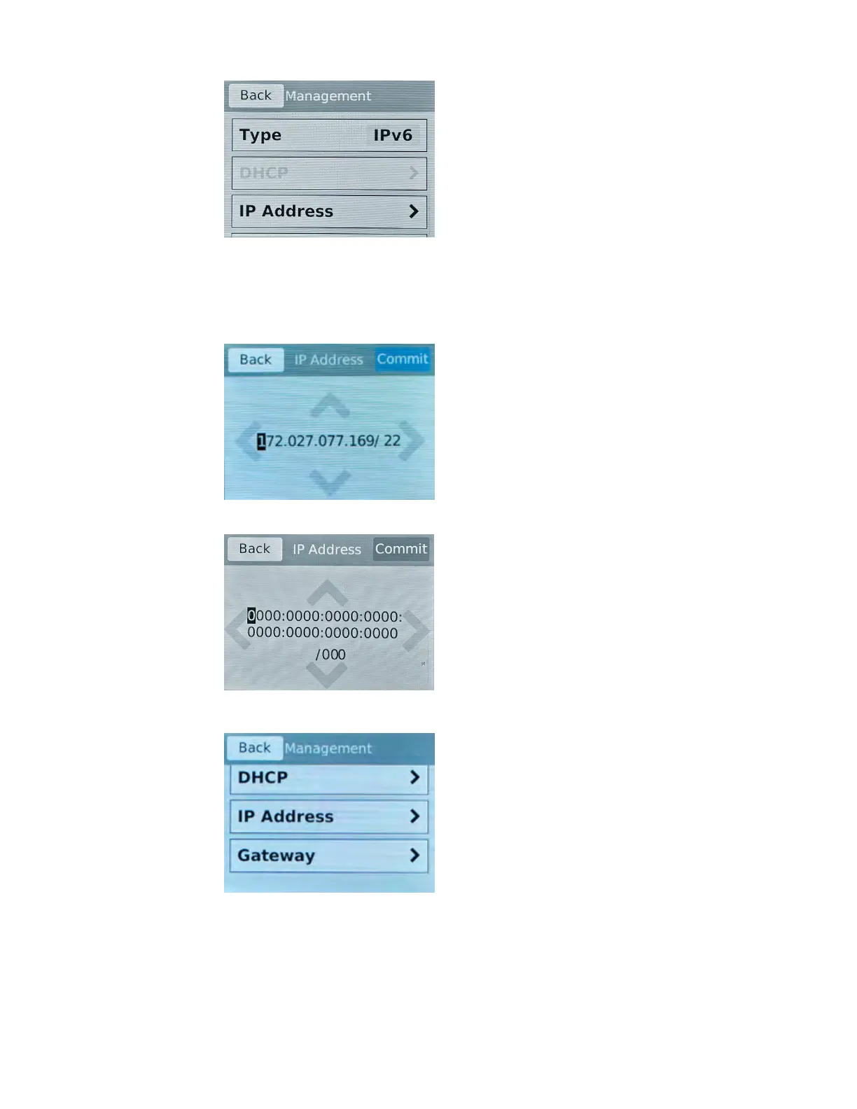 e) Use the left, right, up, and down arrows to configure the management IP address and the length of