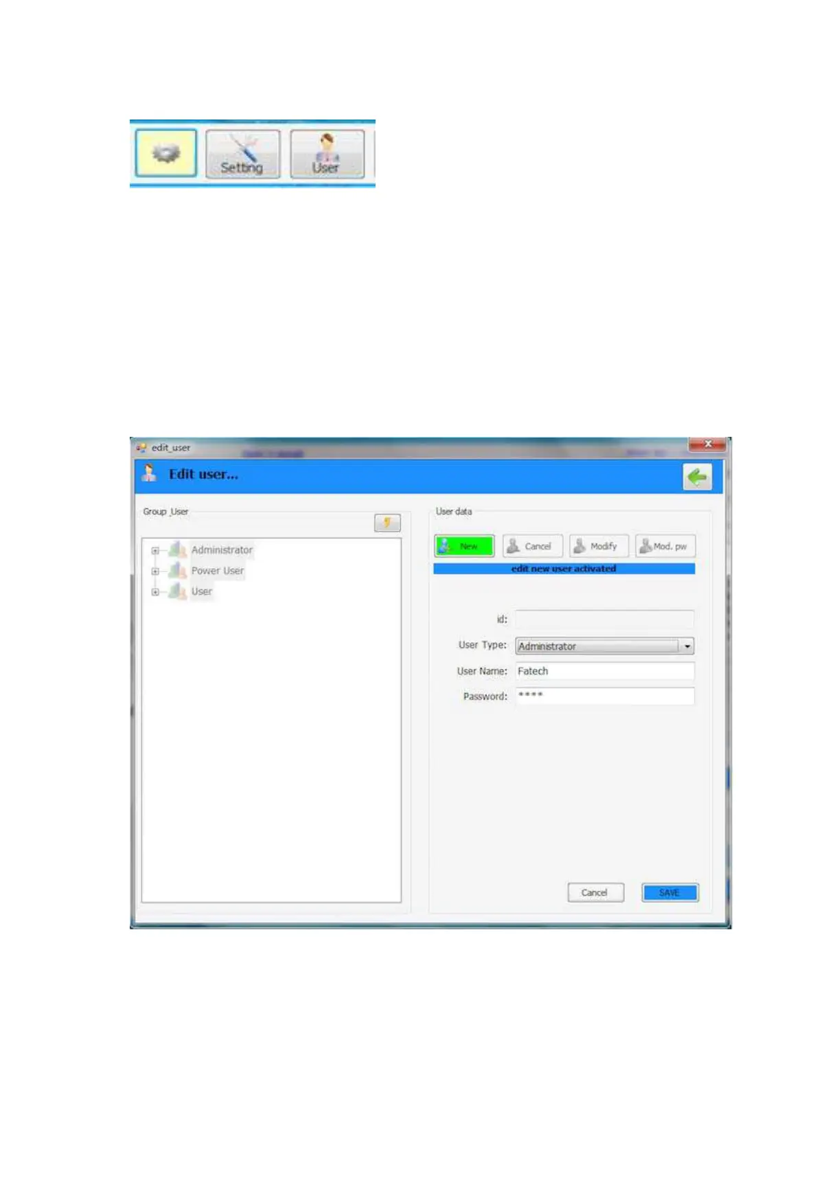 Through the User interface it is possible to define a “User name” a “User Type” and the associated