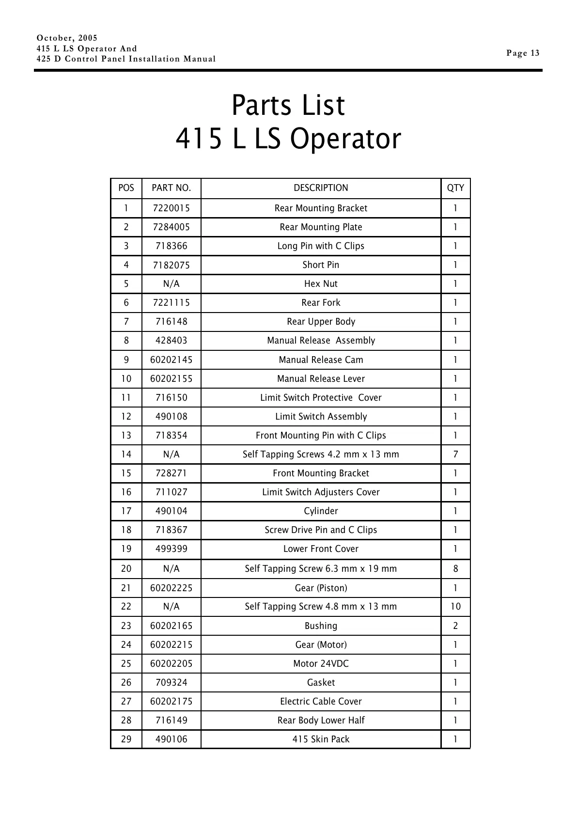 POS PART NO. DESCRIPTION QTY