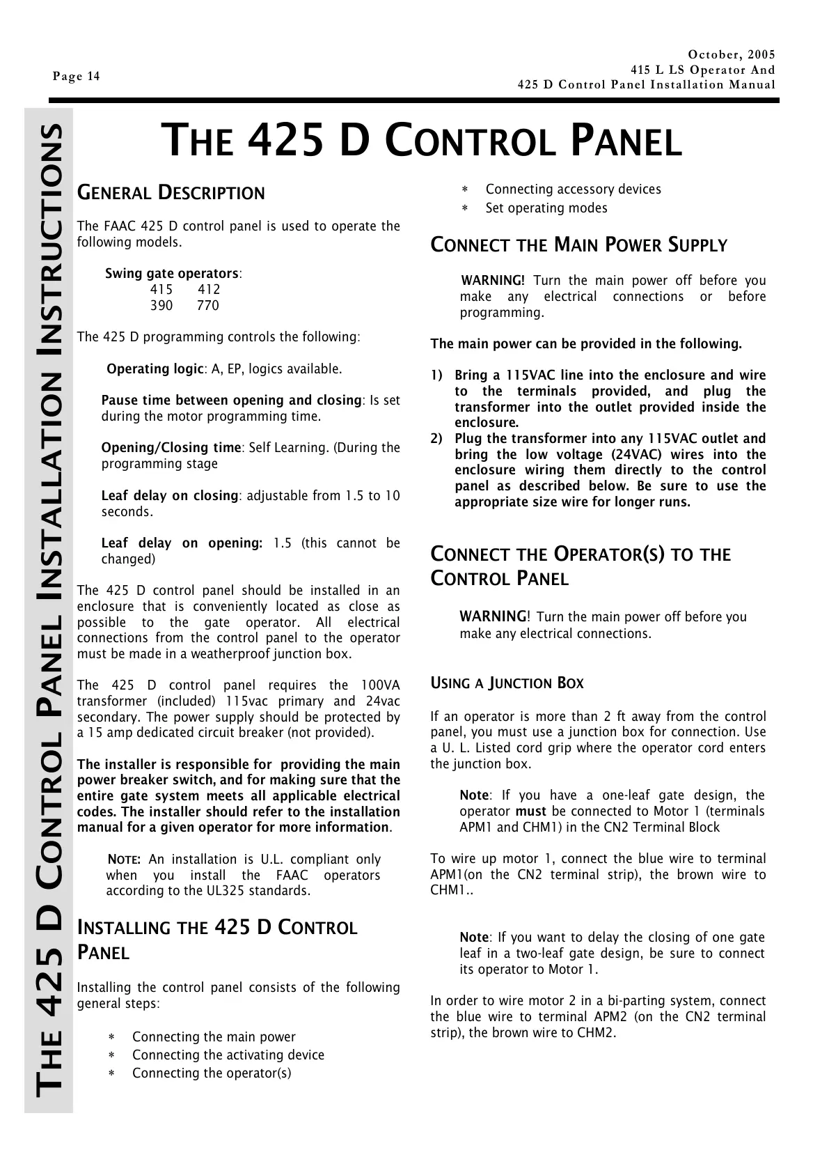 THE 425 D CONTROL PANEL INSTALLATION INSTRUCTIONS
