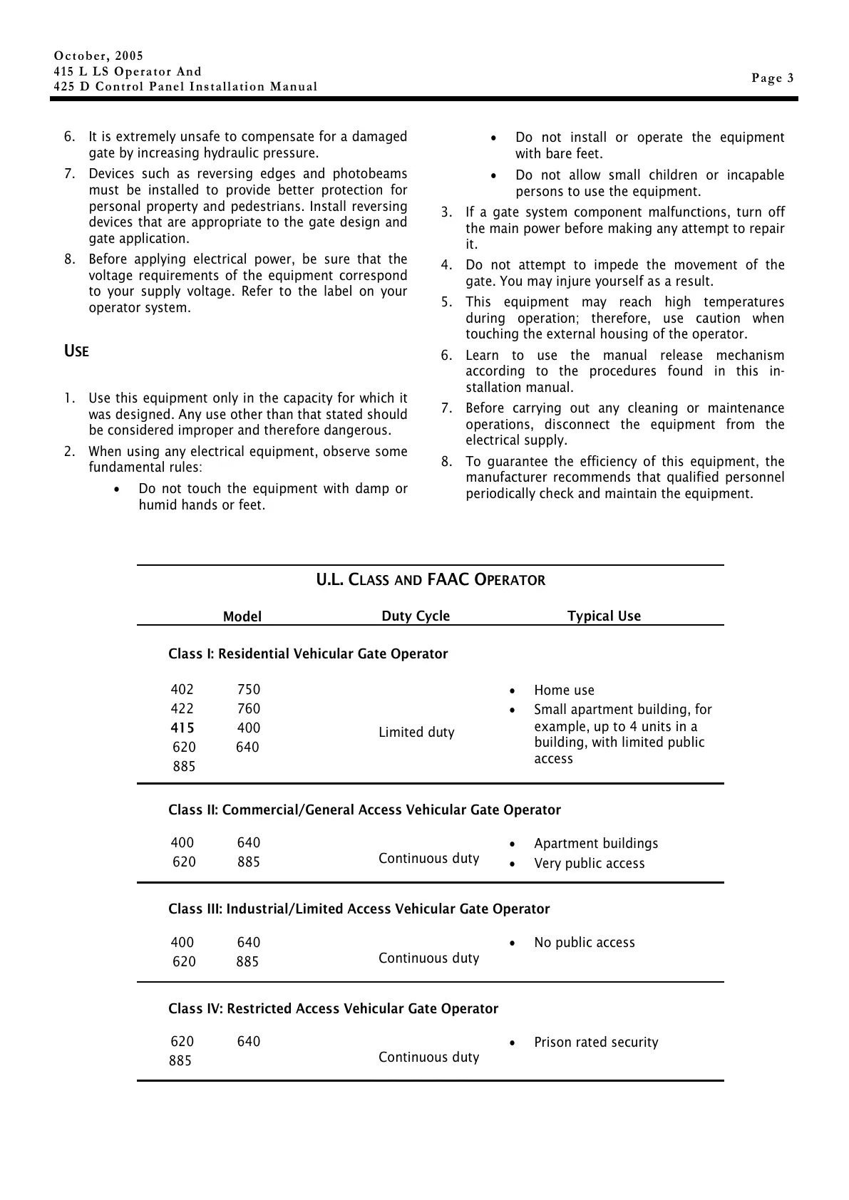 U.L. CLASS AND FAAC OPERATOR