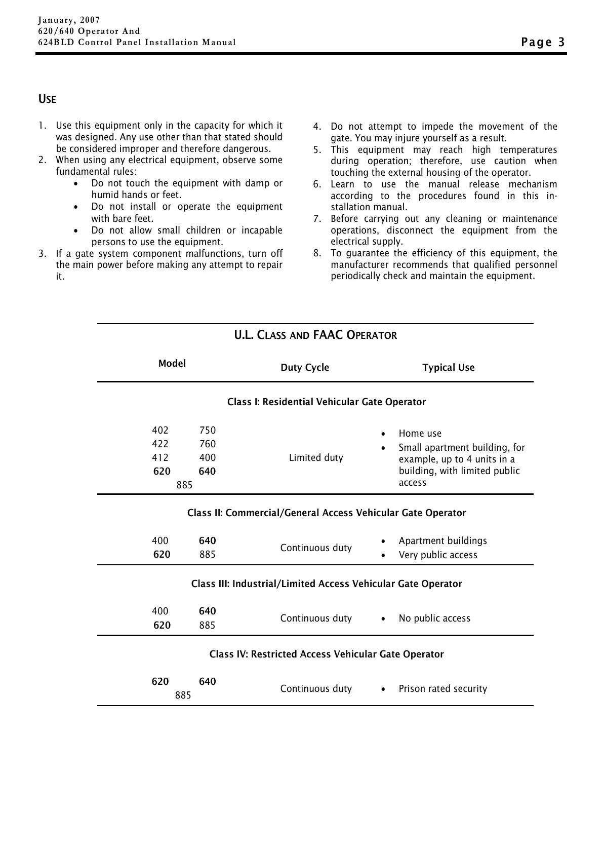 U.L. CLASS AND FAAC OPERATOR