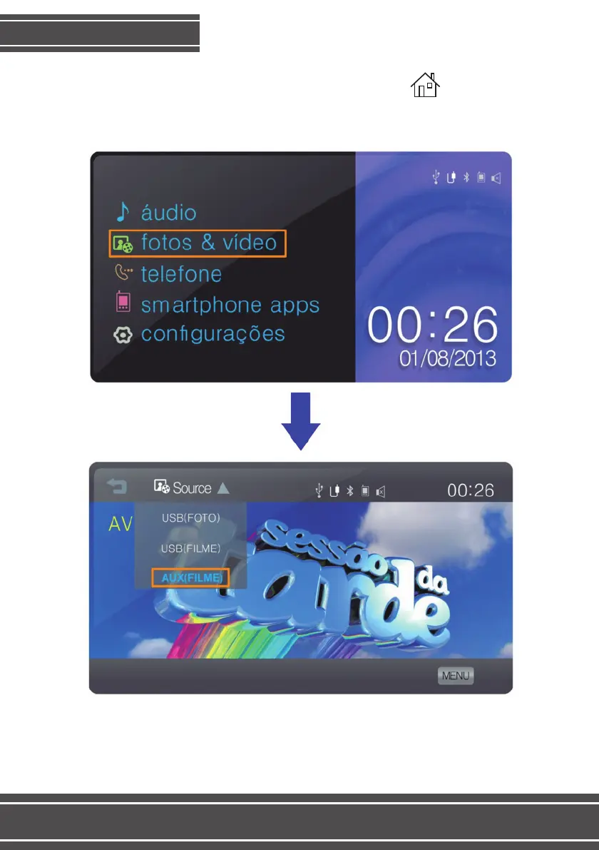 Access the Auxiliary AV input by clicking on the HOME ( ) button, then touch