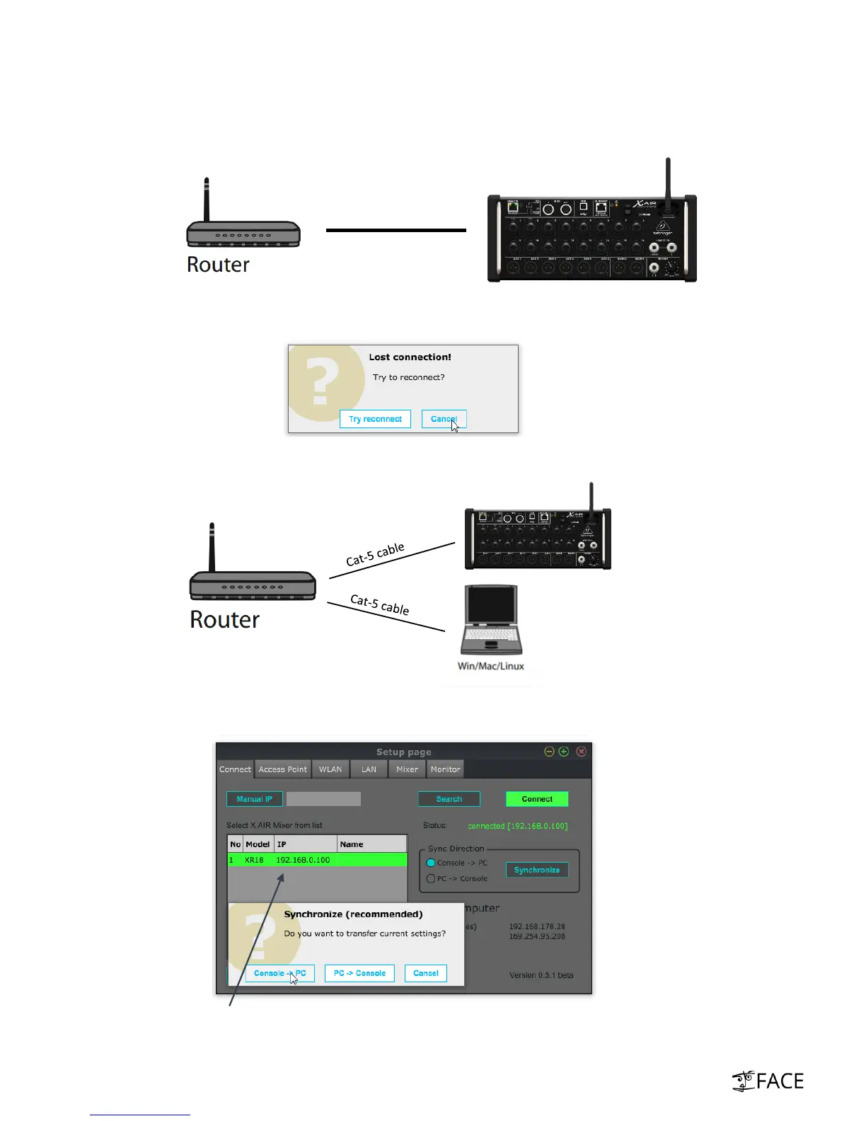 ix. XAir App (Laptop): Open “Connect” tab of “Setup” page. Click Search. Select detected XR18
