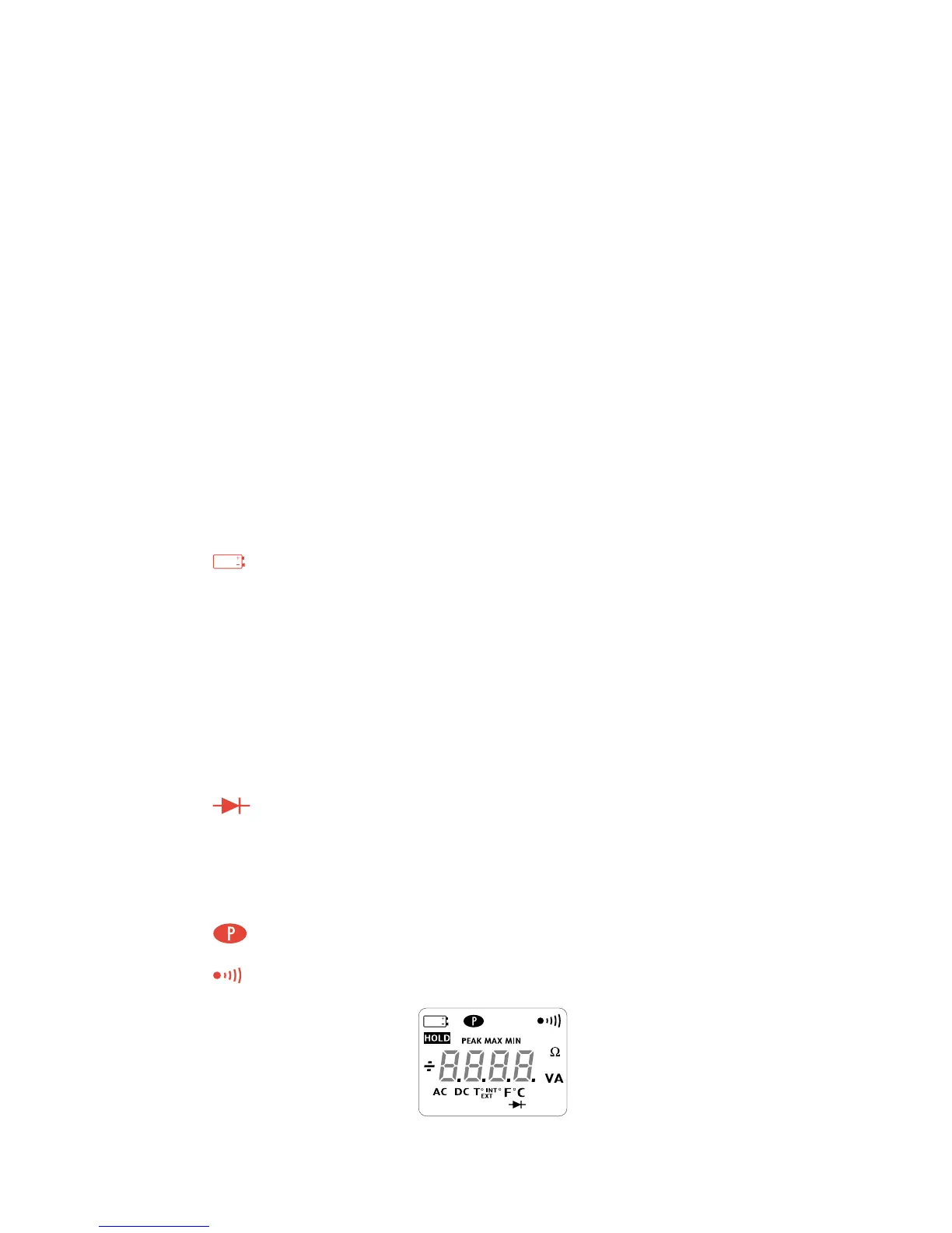 Wskazuje polaryzację dla pomiarów prądu stałego i wartości szczytowej PEAK.